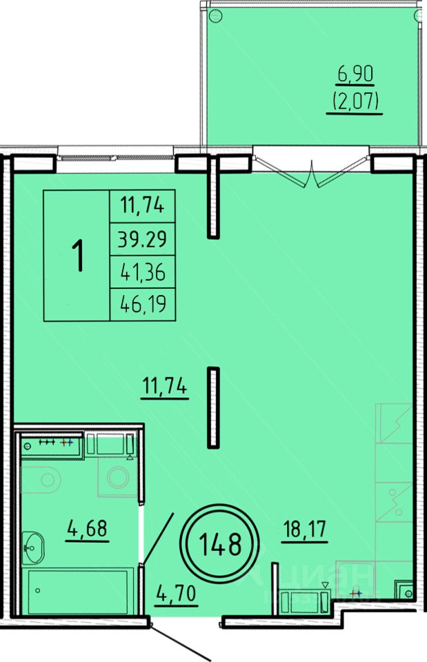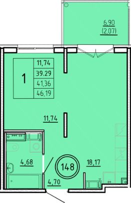 1-комн. квартира, 39,29 м²