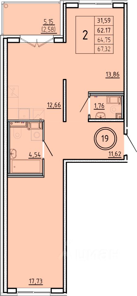 Продаётся 2-комнатная квартира в строящемся доме (Дом 2), срок сдачи: III-кв. 2026, общей площадью 62.17 кв.м., на 2 этаже.