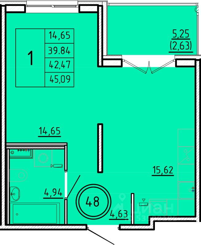 Продаётся 1-комнатная квартира в строящемся доме (Дом 2), срок сдачи: III-кв. 2026, общей площадью 39.84 кв.м., на 1 этаже.