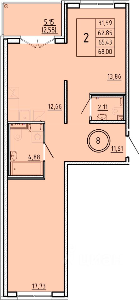 Продаётся 2-комнатная квартира в строящемся доме (Дом 2), срок сдачи: III-кв. 2026, общей площадью 62.85 кв.м., на 1 этаже.