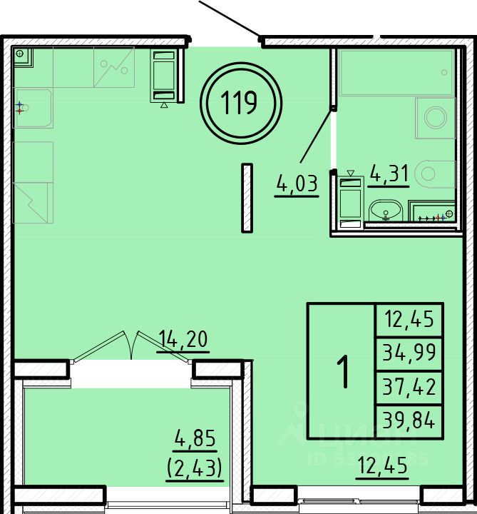 Продаётся 1-комнатная квартира в строящемся доме (Дом 1), срок сдачи: III-кв. 2026, общей площадью 34.99 кв.м., на 2 этаже.