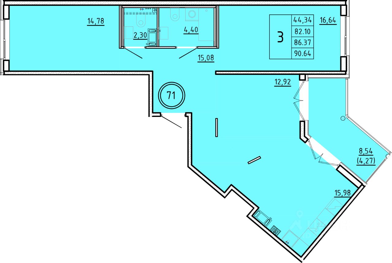 3-комн. квартира, 82,1 м²