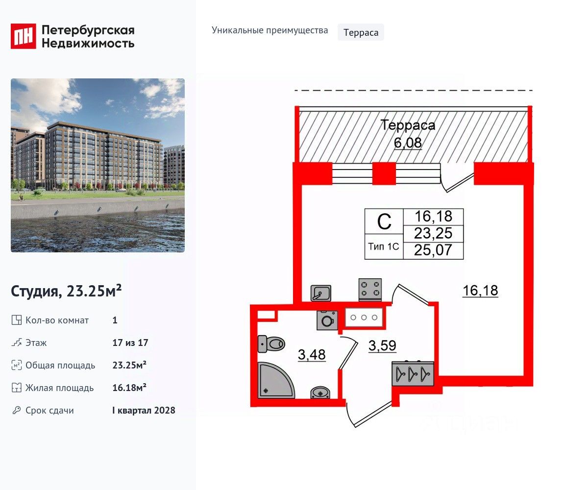 Уникальная, функциональная европланировка, просторная прихожая 3.59 м². Общая площадь студии - 23.25 м², жилая 16.18 м², высота потолка 3.04 м.