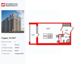 Удобная, классическая, функциональная европланировка, вместительная прихожая 3.24 м². Общая площадь студии - 24.59 м², жилая 18.3 м², высота потолка 2.77 м.