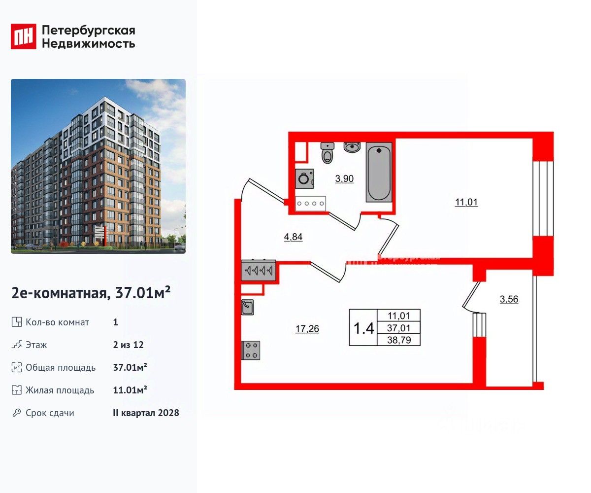 Удобная, классическая, функциональная европланировка, большая кухня-гостиная 17.26 м², просторная прихожая 4.84 м². Общая площадь квартиры - 37.01 м², жилая 11.01 м², высота потолка 2.77 м.