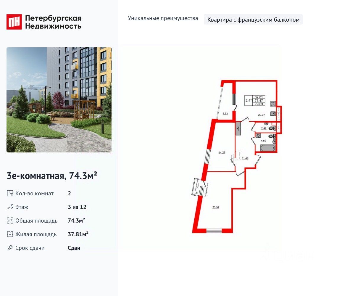 Уникальная, функциональная европланировка, большая кухня-гостиная 20.07 м², просторная прихожая 11.48 м². Общая площадь квартиры - 74.3 м², жилая 37.81 м², высота потолка 2.77 м.