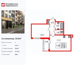 Удобная, классическая, функциональная европланировка, большая кухня-гостиная 17.11 м², просторная прихожая 4.7 м². Общая площадь квартиры - 38.8 м², жилая 12.71 м², высота потолка 3.07 м.