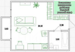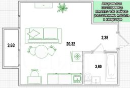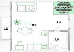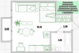 Удачное и продуманное зонирование: нет ощущения тесноты. Можно рассмотреть несколько вариантов расстановки мебели.
