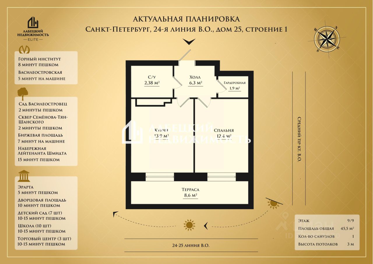 -В ПЕШЕЙ доступности расположены: сквер Семёнова-Тян-Шанского и сад Василеостровец (2 минуты ХОДЬБЫ) для прогулок и отдыха, музей Эрарта (5 минут ХОДЬБЫ), Горный университет (2 минуты ХОДЬБЫ). Также всего за 10 минут транспортом можно добраться до Дворцовой площади, а за 7 минут транспортом до Биржевой площади