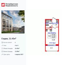 Удобная, классическая, функциональная европланировка, просторная прихожая 3.36 м². Общая площадь студии - 21.45 м², жилая 15.09 м².