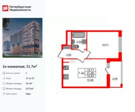 Удобная, классическая, функциональная европланировка, большая кухня-гостиная 15.08 м², вместительная прихожая 3 м². Общая площадь квартиры - 31.7 м², жилая 10.71 м², высота потолка 2.77 м.