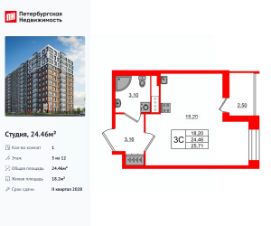 Удобная, классическая, функциональная европланировка, вместительная прихожая 3.16 м². Общая площадь студии - 24.46 м², жилая 18.2 м², высота потолка 2.77 м.