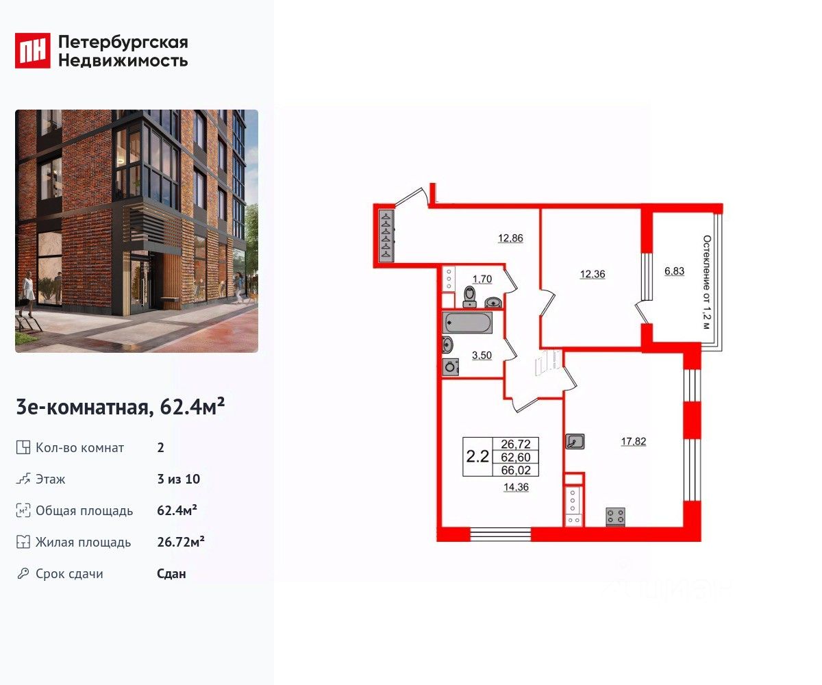 Удобная, классическая, функциональная европланировка, большая кухня-гостиная 17.82 м², просторная прихожая 12.86 м². Общая площадь квартиры - 62.4 м², жилая 26.72 м², высота потолка 2.77 м.