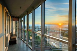 Просторный балкон 6.4 м2 с панорамным остеклением: великолепный вид на город, Вантовый мост и Неву. Здесь можно создать свое рабочее пространство или место для отдыха: наслаждаться утренним кофе и вечерними огнями мегаполиса.