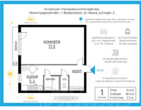 Продается современная 1-комнатная квартира 30 м² на 3 этаже уютного 5-этажного дома в центральной части Всеволожска.