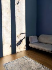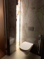 Дизайн проект был выполнен именитым бюро. Ремонт делался для себя известным Петербургским предпринимателем. В отделке использовались исключительно дорогостоящие материалы: практически все каменные детали в интерьере выполнены из цельного мрамора в отличие от современных квартир с индийским керамогранитом. Двери от пола до потолка и паркет выполнены из дорогих пород дерева.