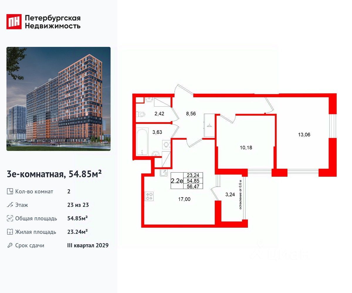 Удобная, классическая, функциональная европланировка, большая кухня-гостиная 17 м², просторная прихожая 8.56 м². Общая площадь квартиры - 54.85 м², жилая 23.24 м², высота потолка 3 м.