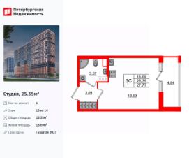 Удобная, классическая, функциональная европланировка, вместительная прихожая 3.09 м². Общая площадь студии - 25.35 м², жилая 18.69 м², высота потолка 2.75 м.