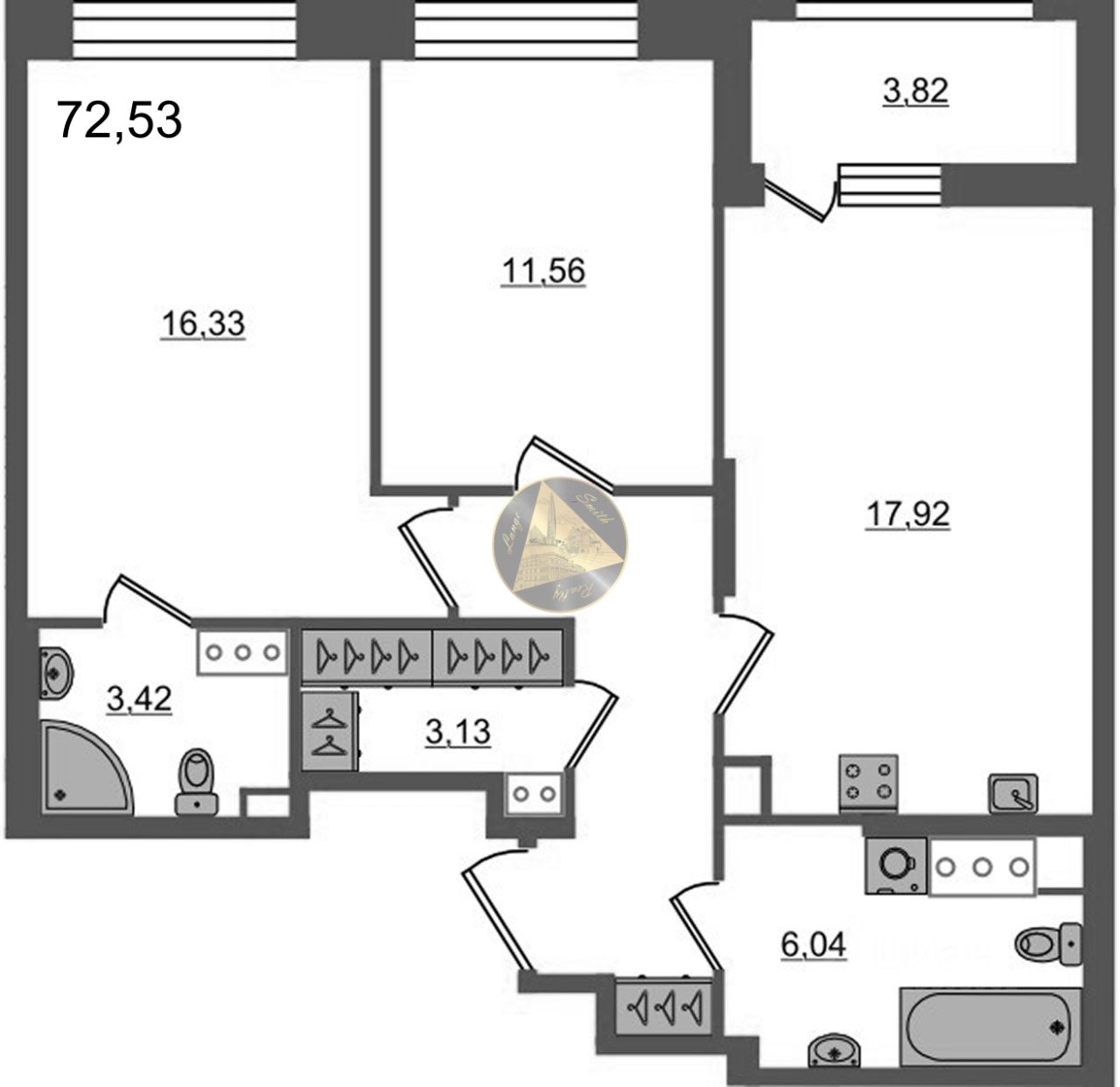 Совмещённый санузел 6.04 м2. Гардеробная 3.13 м2.