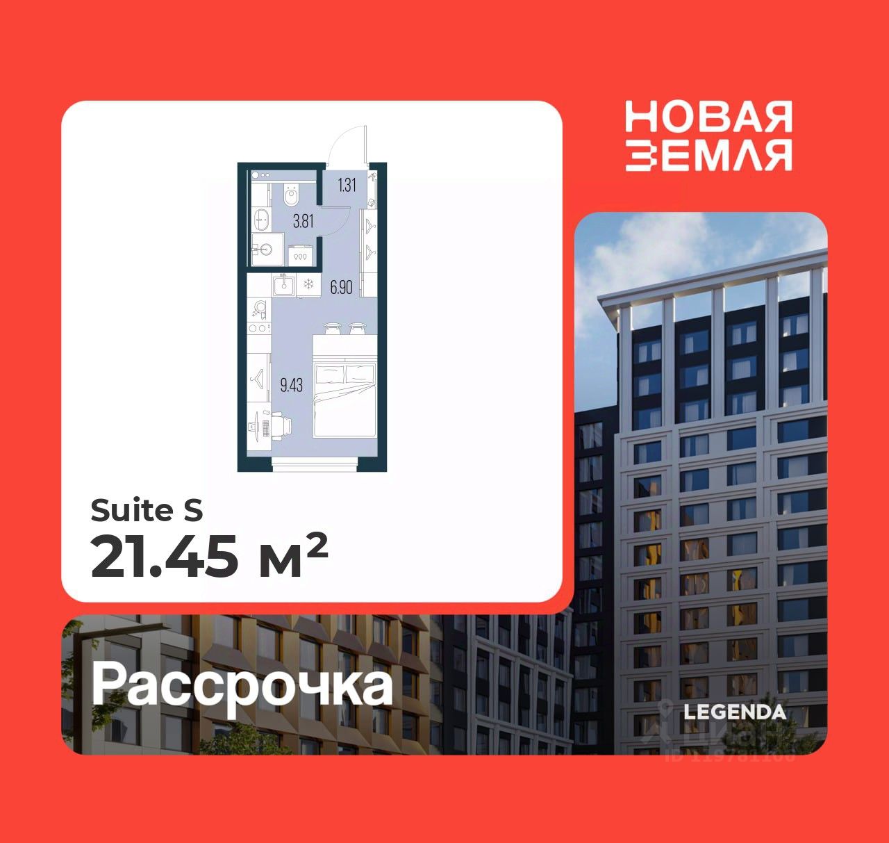 1-комн. квартира-студия с предчистовой отделкой в ЖК "Новая Земля" на 7 этаже. Общая площадь: 21.45 кв.м., площадь гостиной 16.33 кв.м., из которых 6.9 кв.м. выделено под кухонную зону. Все окна выходят на одну сторону. В квартире один совмещенный санузел. Высота потолков 2.85 м.