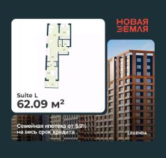 Продается двухкомнатная квартира с предчистовой отделкой в ЖК "Новая Земля" на 3 этаже. Общая площадь: 62.09 кв.м. Высота потолков 2.85 м.