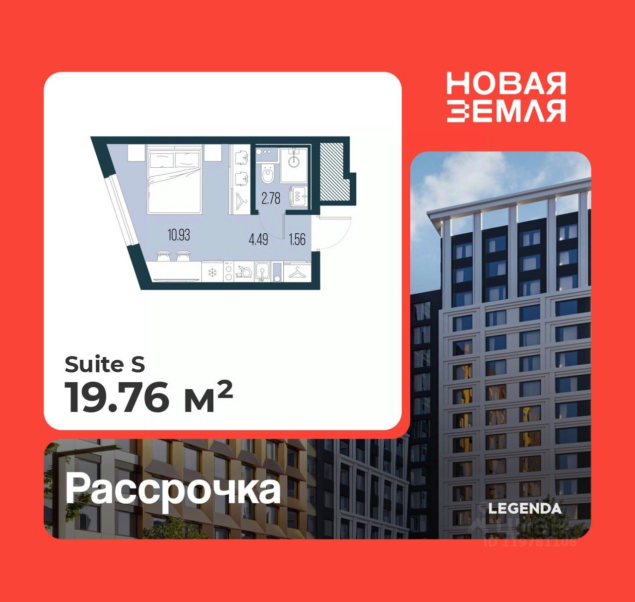 1-комн. квартира-студия от застройщика с предчистовой отделкой в ЖК "Новая Земля" на 4 этаже. Общая площадь: 19.76 кв.м., площадь гостиной 15.42 кв.м., из которых 4.49 кв.м. выделено под кухонную зону. Все окна выходят на одну сторону. В квартире один совмещенный санузел. Высота потолков 2.85 м.