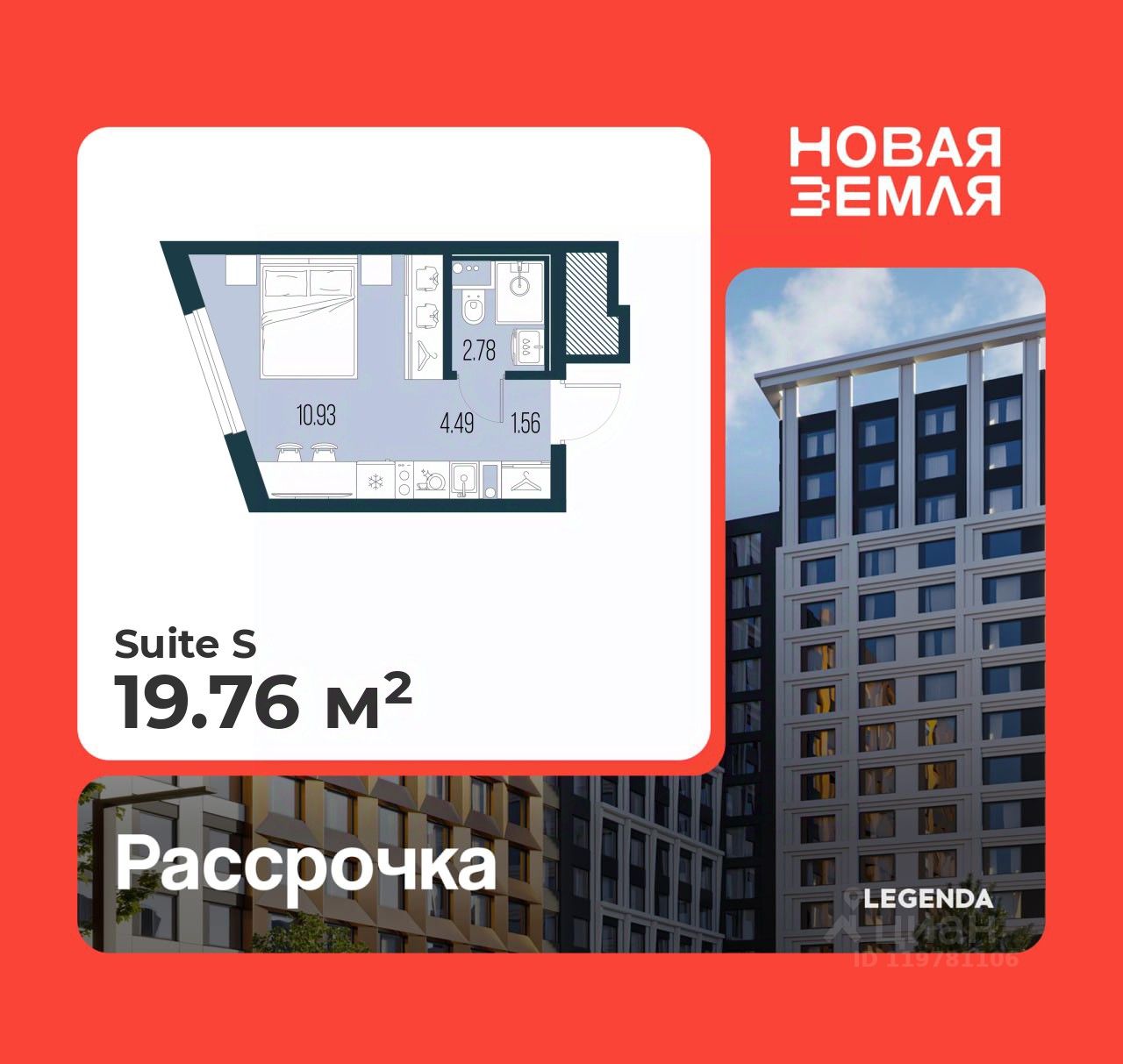 1-комн. квартира-студия от застройщика с предчистовой отделкой в ЖК "Новая Земля" на 10 этаже. Общая площадь: 19.76 кв.м., площадь гостиной 15.42 кв.м., из которых 4.49 кв.м. выделено под кухонную зону. Все окна выходят на одну сторону. В квартире один совмещенный санузел. Высота потолков 2.85 м.
