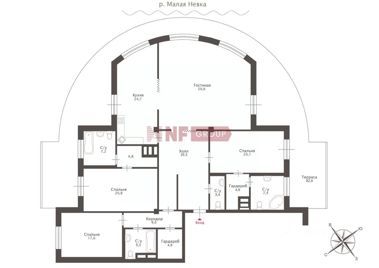 Лот: 99292. Статусная видовая квартира на Крестовском с прямым видом на воду. Планировкой предусмотрены три спальни и просторная гостиная. Прямой вид на Малую Невку. Из каждой комнаты есть выход на просторную террасу с прямым видом на воду и зелень Крестовского острова. Панорамные окна в пол в каждой комнате. Три спальни, каждая со своей гардеробной и санузлом.
