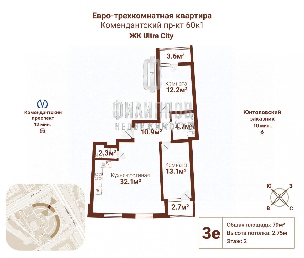Продается светлая и уютная евро-трехкомнатная квартира 79м2 рядом с метро и парком в ЖК Ультра Сити!