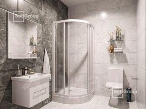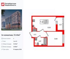 Удобная, классическая, функциональная европланировка, большая кухня-гостиная 15 м², вместительная прихожая 4.11 м². Общая площадь квартиры - 33.44 м², жилая 10.06 м², высота потолка 2.77 м.