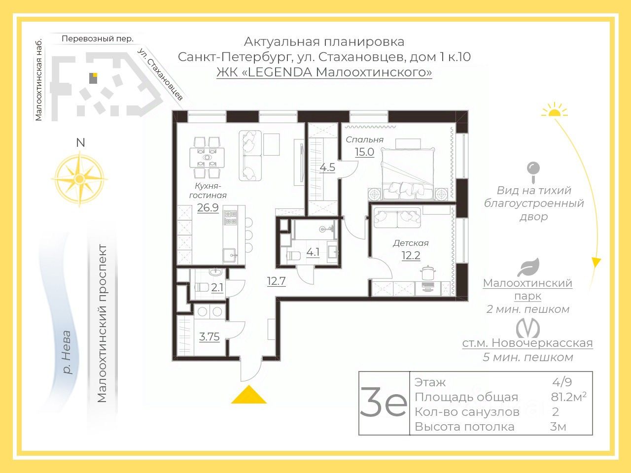 Квартира расположена на 4-м этаже . Окна квартиры смотрят в тихий благоустроенный двор. Квартира имеет интересное планировочное решение : кухня-гостиная 25 м2 с большими окнами, две изолированные спальни 15.31+12.31 м2, два санузла, просторная гардеробная.