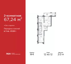2-комн. квартира от застройщика в Клубный квартал "Ассамблея" на 12 этаже. Квартира без отделки, после оформления собственности можно делать ремонт. Общая площадь: 67.24 кв.м. Высота потолков 3.0 м.