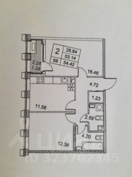Общая площадь 54,3 м плюс застекленная лоджия 2 м.