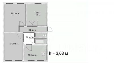 Общая площадь квартиры - 108,7 кв.м, кухня - 13,40 кв.м, комнаты - 24.20, 30.20 и 20.20 кв.м, потолки 3.63 м.