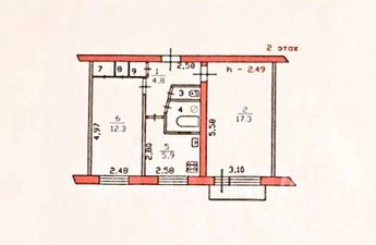 Общая площадь квартиры 44,65 кв.м, кухня 5,9 кв.м, комнаты изолированные 17,3 кв.м и 12,3 кв.м, санузел раздельный, балкон.