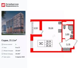 Удобная, классическая, функциональная европланировка, вместительная прихожая 3.18 м². Общая площадь студии - 25.11 м², жилая 18.24 м², высота потолка 2.77 м.