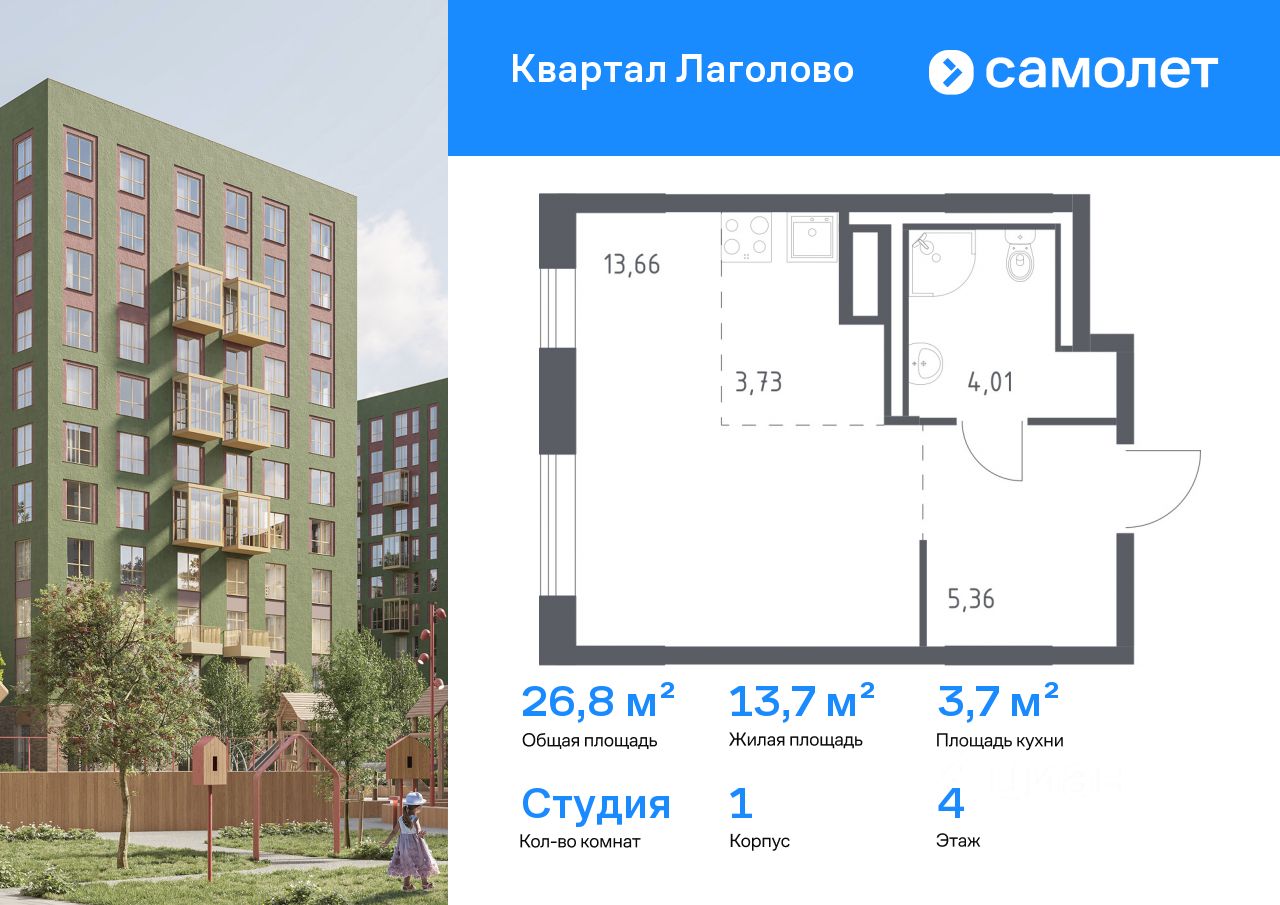Строим кварталы для жизни с заботой о будущем. Предлагается квартира студия комфорт-класса 26,75 кв.м в корпусе 1 на 4 этаже, в ЖК "Квартал Лаголово"
