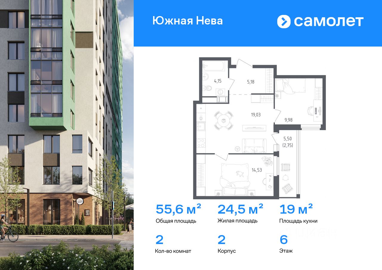 Строим кварталы для жизни с заботой о будущем. Предлагается 2-комнатная квартира комфорт-класса 55,62 кв.м в корпусе 2 на 6 этаже, в ЖК "Южная Нева"