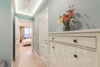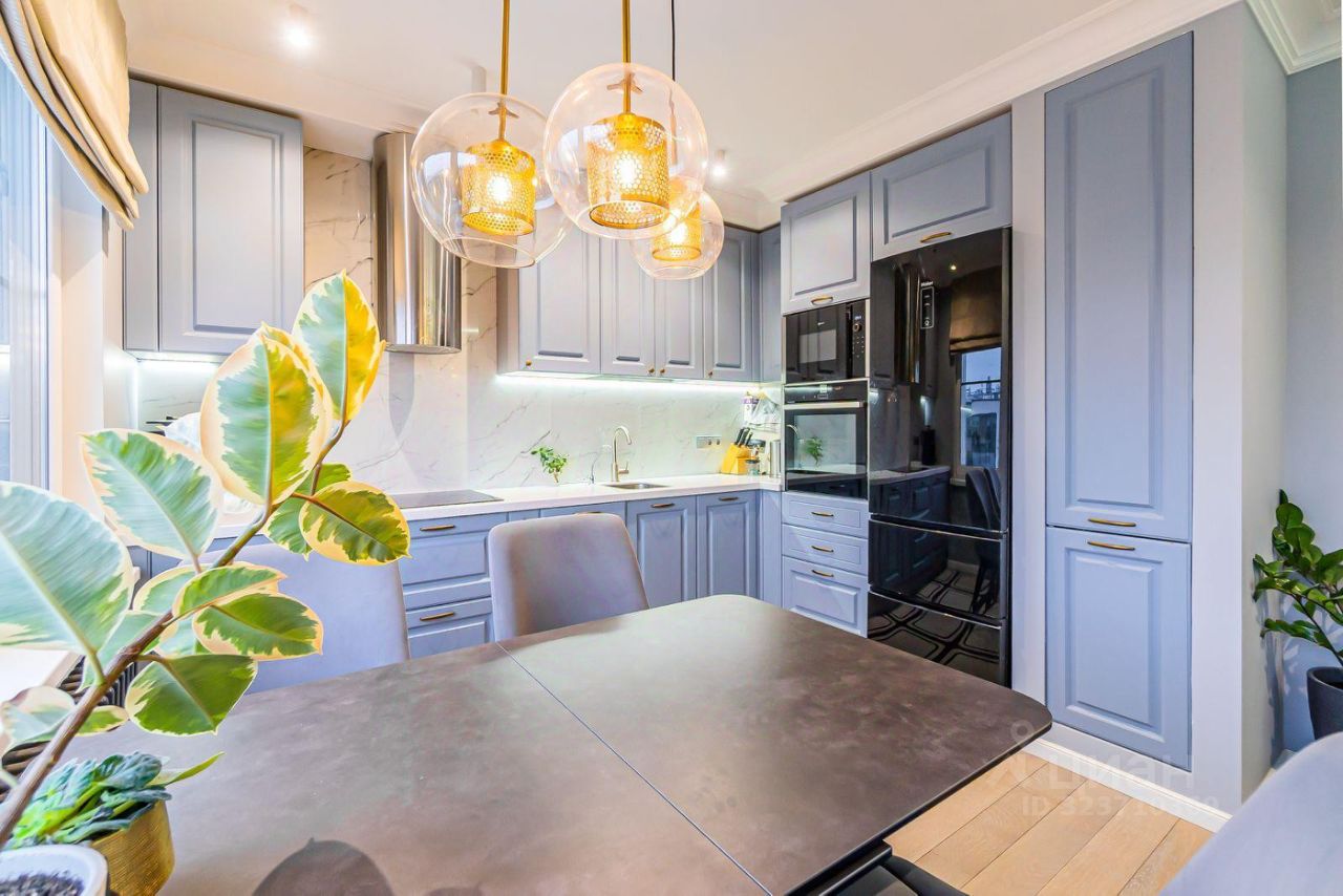 Квартира оформлена по авторскому дизайн-проекту (2020) с применением премиальных материалов и продуманных инженерных решений. В отделке использована натуральная карельская паркетная доска, стены окрашены Little Greene, установлены декоративные галтели и многоуровневые потолки со встроенной LED-подсветкой.