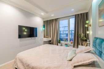 Окна выходят на две стороны: две комнаты с панорамным остеклением — в сторону Невы и ЖК Империал, кухня-гостиная — в тихий благоустроенный двор.