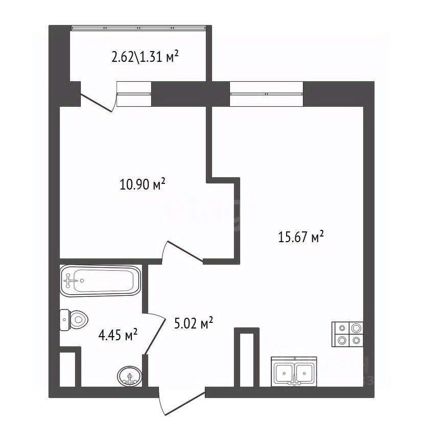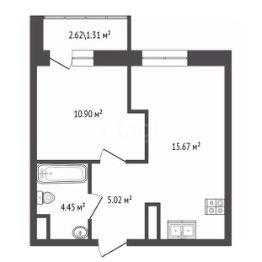 комната площадью 10.90 кв.м., кухня 15.67 кв.м., прихожая - 5.02 кв.м., санузел - 4.45 кв.м., площадь лоджии - 2.62 кв.м. с панорамным остеклением и с шикарными потолками 3 метра!