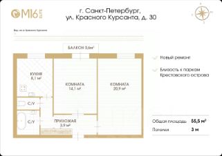 - Одна из лучших локаций. Близость к паркам Крестовского и Петровского островов, любимых мест для прогулок и активного отдыха. Развитая инфраструктура микрорайона. Рядом все: магазины, кафе, метро, всевозможные бытовые службы, медицина, учебные заведения на любой возраст, музеи, театры и т.д