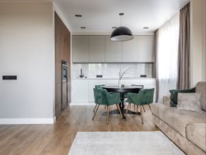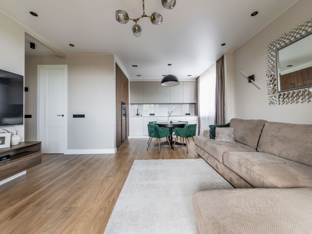 Стены: обои под покраску. Пол: ламинат 12 мм с звукоизолирующим подложным материалом. Межкомнатные двери 2.3 м высотой.