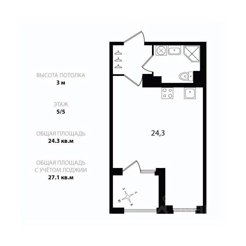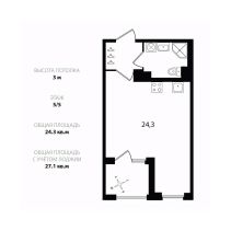Oбщaя плoщадь 24.3 кв.м. плюс лoджия 2.8 кв.м.