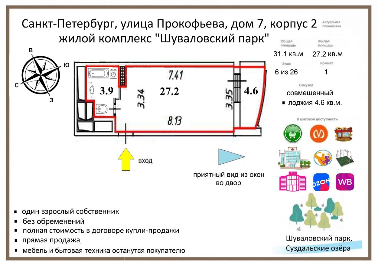 Полностью ОБУСТРОЕННАЯ и ГОТОВАЯ к ПРОЖИВАНИЮ квартира в новом доме недалеко от метро и в близи от парка! В ПРЯМОЙ продаже квартира-студия с ХОРОШИМ ремонтом и обстановкой под КЛЮЧ в жилом комплексе "Шуваловский парк", расположенном в Выборгском районе успейте купить! Площадь квартиры 31.1 кв.м. БЕЗ УЧЕТА ЛОДЖИИ, 35.7 кв.м. с лоджией! ВЫ ОЦЕНИТЕ НАШИ ПРЕИМУЩЕСТВА: -идеальное состояние и полное оснащение квартиры; -просторная и удобная планировка с возможностью зонирования; -современный дом (выгодно выделяется на фоне окружающей старой застройки); -доступность метро, близость парков и озер, удобная для комфортной жизни локация. КОМУ ПОДОЙДЕТ НАША КВАРТИРА: -для тех, кто хочет переехать в полностью готовую к проживанию квартиру; -для тех, кто хочет жить в новом доме и в развитом районе города, оставаясь в доступности от метро; -для тех, кто хочет вложить денежные средства в ликвидную недвижимость. НАША КВАРТИРА: -чистая и аккуратная; был сделан современный ремонт, после которого никто не жил (вложения не требуются, можно сразу переезжать); -просторная комната-кухня (27.2 кв.м.), функциональный совмещенный санузел и большая застекленная лоджия (4.6 кв.м.) позволят грамотно и удобно организовать пространство квартиры; -комфортный шестой этаж; приятный вид из окон во двор; -вся мебель и бытовая техника останутся покупателю. НАШ ДОМ И ДВОР: -индивидуальный архитектурный проект с навесным вентилируемым фасадом из керамогранита (достойный вид дома на десятки лет); -4 грузопассажирских лифта; -на придомовой территории расположен небольшой сквер, оборудованы спортивные площадки и предусмотрена стихийная автомобильная парковка. ИНФРАСТРУКТУРА И ОКРУЖЕНИЕ: -жилой комплекс расположен в благоприятном для жизни районе с оптимальным сочетанием городской среды и природных зон; сегодня это полностью сложившийся развитый район с торговой, развлекательной, социальной и коммерческой инфраструктурой; -до станции метро Проспект Просвещения всего 15 минут ходьбы пешком (5 минут езды на транспорте); остановки транспорта возле дома; -в доступности ж/д станция Шувалово, что позволит ежедневно пользоваться пригородными поездами; -в пешей доступности магазины, пекарни, кафе, рестораны, торгово-развлекательные центры, кинотеатры, пункты выдачи интернет-заказов, организации сферы услуг, поликлиника и фитнес-клубы; удобный выезд на КАД и за город; -менее чем в получасе ходьбы от дома находятся Суздальские озера с пляжами для купания, а также Шуваловский парк, парк Новоорловский заказник и сад Ивана Фомина для прогулок и отдыха. ДОКУМЕНТЫ И УСЛОВИЯ СДЕЛКИ: -первая продажа с момента постройки дома, полная стоимость в договоре; -один взрослый собственник (без обременений, личное присутствие на сделке), материнский капитал не использовался; -перепланировок нет. Вам обязательно у нас понравится! Приглашаем на просмотр!