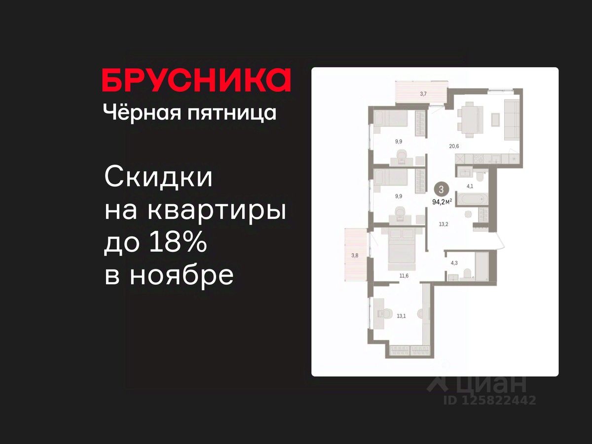 Трехкомнатная квартира от застройщика с предчистовой отделкой в ЖК "Брусника в Новоселье" на 7 этаже. Общая площадь: 94.2 кв.м., жилая: 31.4 кв.м., площадь просторной кухни-столовой: 20.6 кв.м. Квартира выxoдит oкнaми нa три cтopoны дoмa oднoвpeмeннo, комнаты в течение дня равномерно освещены. В квартире два балкона, два совмещенных санузла. Высота потолков 2.7 м.