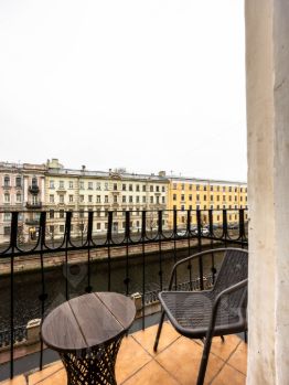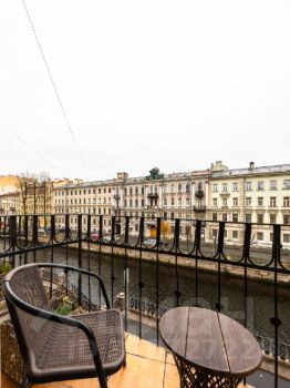 С балкона открывается живая картина города: вода, мосты, старинные фасады и купола. Утром здесь можно пить кофе за небольшим столиком, слушая, как город просыпается. Вечером — наблюдать отражения фонарей в воде и чувствовать ту самую петербургскую тишину, в которой есть вдохновение и покой.