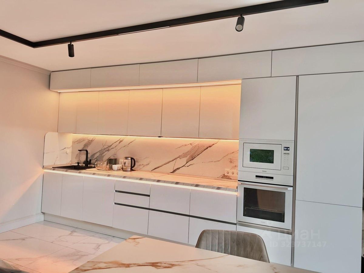 Премиальная кухня с фасадами Fenix , трёхуровневая подсветка управляется голосовым помощником Алиса, установлена техника Haier.