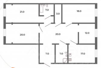 Кухня 17 м²; прихожая-гостиная 27 м² с выделенной гардеробной зоной; три спальни и комната-кабинет (также может быть использована как гостевая спальня).