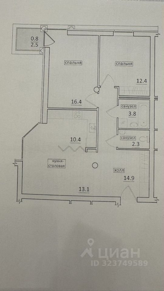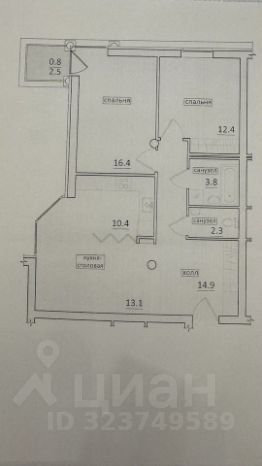 Жилая 16.4 (с вых. На балкон)+12.4 м2.